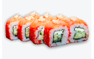 Рис, норі, лосось, крем-сир, огірок, ікра масаго, соус спайс