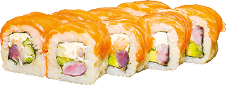 Рис, норі, лосось, крем-сир, огірок, ікра масаго, соус спайс