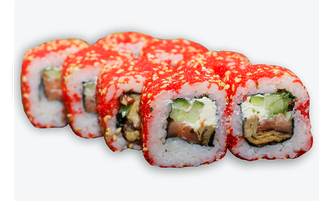 Рис, норі, лосось, тамаго, крем-сир, огірок, ікра масаго, кунжут