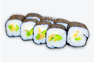 рис, норі, крем-сир, гарбуз маринований, лосось-гриль, кунжут, соус унагі