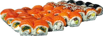 Рис, норі, лосось, тамаго, крем-сир, огірок, ікра масаго, кунжут