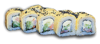рис, норі, крем-сир, тунець, огірок, ікра масаго, темпура, панко, соус унагі, соус спайс, кунжут